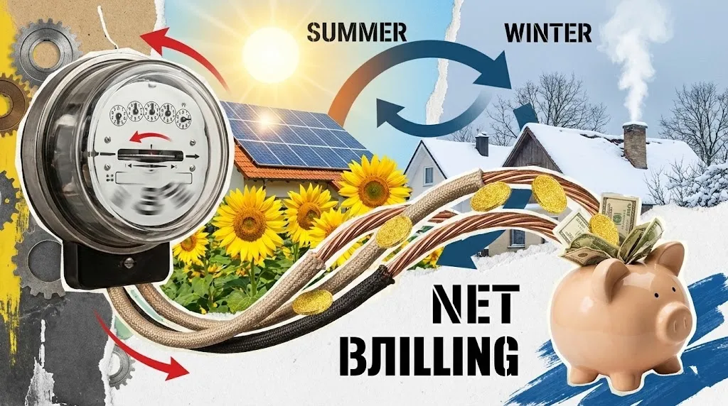 Як це працює: Влітку ви виробляєте багато енергії. Ви “зливаєте” надлишок у загальну мережу. Лічильник рахує це не в кіловатах, а в гривнях (за ринковою ціною). Ці гроші лягають на ваш віртуальний рахунок. Взимку або вночі, коли сонця немає, ви берете енергію з мережі, але не платите живими грошима, а списуєте з того віртуального рахунку.