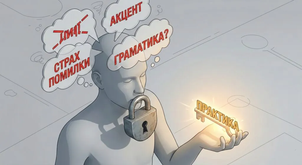 Це не ваша вина. Це вина шкільної системи, яка карала за помилки червоною ручкою. Це вина мозку, який в умовах хронічного стресу війни блокує центри мовлення. І це вина ілюзії, що “спочатку треба вивчити всю граматику, а тільки потім говорити”.