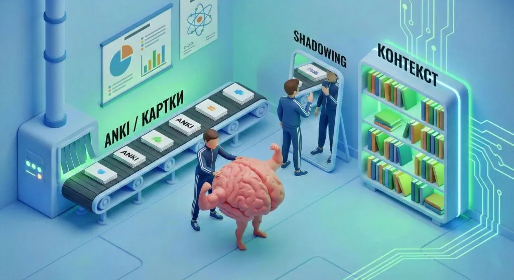 Забудьте про стовпчики слів: “Table – Стіл”. Це найгірший спосіб навчання. Ваш мозок не запам’ятовує сміття без контексту.